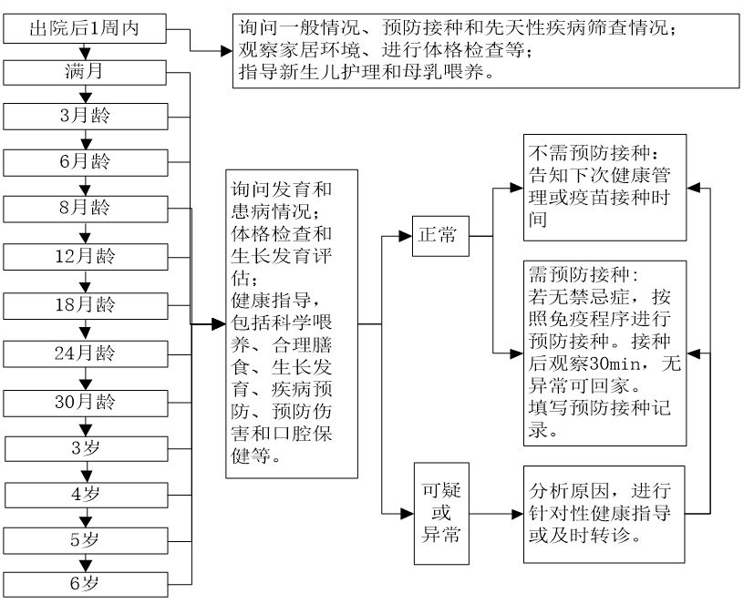 1、新生儿家庭访视:新生儿出院后1周内,医务人员到新生儿家中进行,同时进行产后访视。了解出生时情况、预防接种情况,在开展新生儿疾病筛查的地区应了解新生儿疾病筛查情况等。观察家居环境,重点询问和观察喂养、睡眠、大小便、黄疸、脐部情况、口腔发育等情况。为新生儿测量体温、记录出生时体重、身长,进行体格检查,同时建立母子健康手册。根据新生儿的具体情况,对家长进行喂养、发育、防病、预防伤害和口腔保健指导。如果发现新生儿未接种卡介苗和第1剂乙肝疫苗,提醒家长尽快补种。如果发现新生儿未接受新生儿疾病筛查,告知家长到具备筛查条件的医疗保健机构补筛。对于低出生体重、早产、双多胎或有出生缺陷等具有高危因素的新生儿根据实际情况增加家庭访视次数。